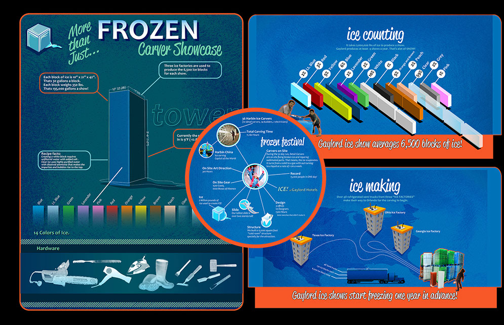 Various info graphic print and production posters.